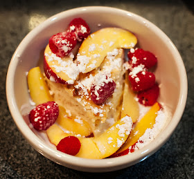 Set the oven to bake at 425. In a medium bowl combine Bisquick, sugar, butter, and milk and mix together until well combined. Then spoon into a greased pie pan. Bake for 15-17 minutes. Then while still hot cut and serve into bowls, top with fruit, powdered sugar, and half and half. My family has also tries this with strawberries, raspberries, and oranges and it all tasted fantastic, Enjoy! Serves 8
